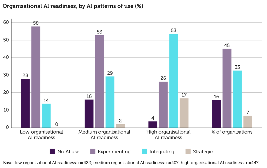 This is reflected in the survey data: around 42% of organisations experimenting with AI fall into the lowest organisational readiness group, meaning they lack strength across these core capability areas.
