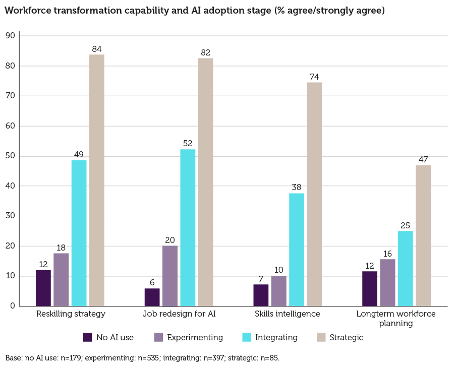 Among organisations where AI is strategically embedded, over 80% report both job redesign and reskilling activity. By contrast, organisations still experimenting with AI are far less likely to have these in place.